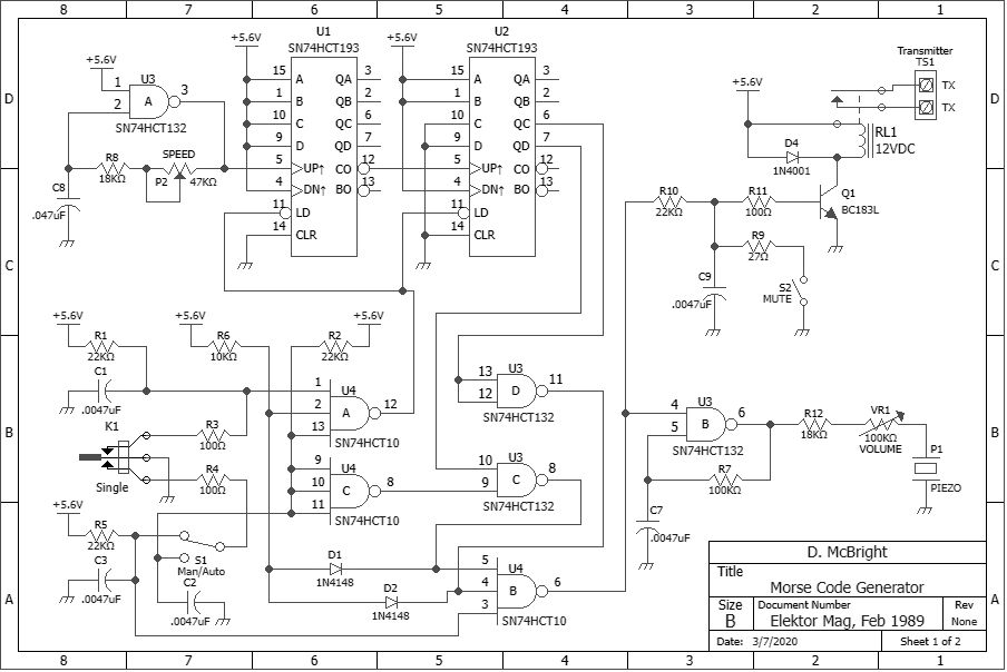 Output from the generator is a normally-open relay contact for connecting to the CW transmitter. A switch is included to disable the morse relay and so reduce the current consumption while practising. The morse generator is powered by a 9V battery or by a mains adapter with an output between 8 and 15 VDC. An internal voltage regulator supplies 5.6 V for the integrated circuits.