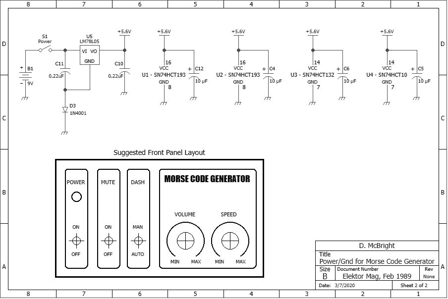This circuit was included in a article by D. McBright, in the February 1989 issue of Elektor Magazine. The original schematic used "IC" and "N" as Reference Designators. I changed this to using a common "U" designator bacause my drawing library only allow "U". I also adjusted the text accordingly. I shuffled the schematic a bit to fit better in this format and moved the Power/Ground arrangement to a separate page. The Power/Ground page also includes a drawing of the suggested layout, minus a few minor details.